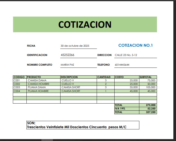 Base de datos mediante la cual, sin aplicaciones adicionales a las que maneja diariamente puede llevar un control de su inventario de mercancías, relacionando las compras vs las ventas, tiene la opción de elaborar cotizaciones, creamos bases de datos adaptables según sus necesidades.